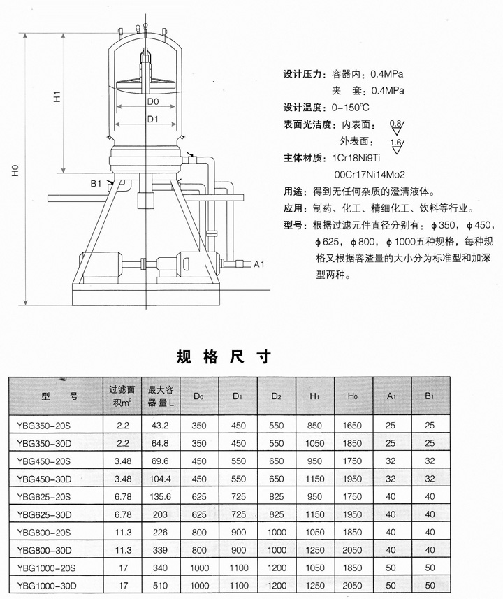 YGB系列葉板式過濾器: 是吸收西歐、日本同類設(shè)備的基礎(chǔ)上自行研制的一種新型高效過濾設(shè)備,可以得到無任何顆粒的澄清液體,廣泛應用于制藥、精細化工、飲料等行業(yè)。該設(shè)備符合國際國內(nèi)制藥行業(yè)GMP要求及美國FDA的要求。 特點: 1.過濾體積大,速度快。 2.24層過濾網(wǎng),過濾充分且精度高,可達到0.2微米。 3.容器外殼設(shè)有夾套,可滿足不同工藝要求的濾液要求 4.過濾材料廣泛,使用后該設(shè)備還有反沖洗操作,使過濾材料在原位置再生無需打開清洗。 5.整個過濾工藝過程全封閉操作,不會受到外界污染。 6.適應不同品種濾液要求,實現(xiàn)一機多用。